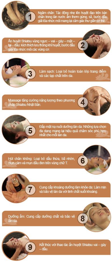 Liệu trình chăm sóc da toàn diện, chống và trị nám, sạm, trị mụn hiệu quả, giúp tái tạo, sản sinh các tế bào mới, cung cấp dưỡng chất thiết yếu, tăng cường sức đề kháng cho da, mang đến làn da căng mịn, tránh hiện tượng nứt nẻ, bong tróc và kích ứng trong mùa hanh khô. Đến với chăm sóc da - bổ sung năng lượng theo phương pháp bấm huyệt Shiatsu không những bạn được chăm sóc da chống lão hóa toàn diện mà còn được tận hưởng sự thư thái tĩnh lặng trong không gian đậm chất thiền.